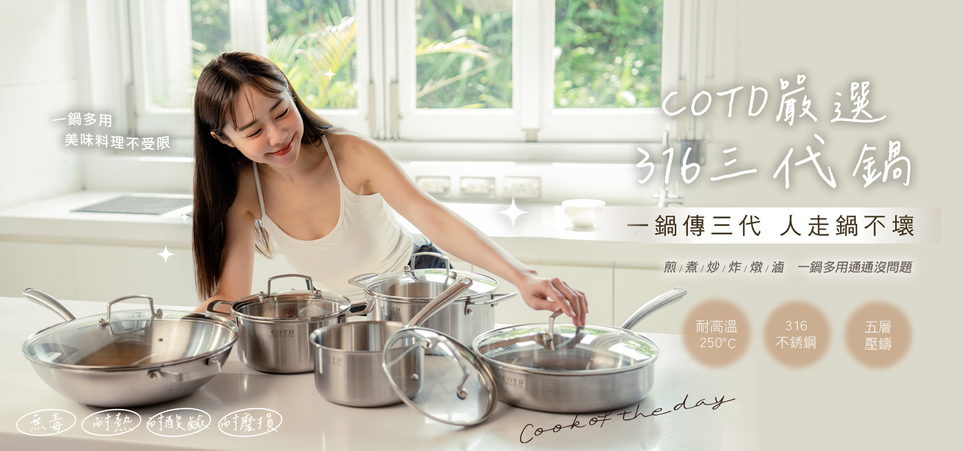 COTD鍋具組從製作過程開始排除不良成分,嚴選安心無毒材質,推廣無油好烹煮健康概念。